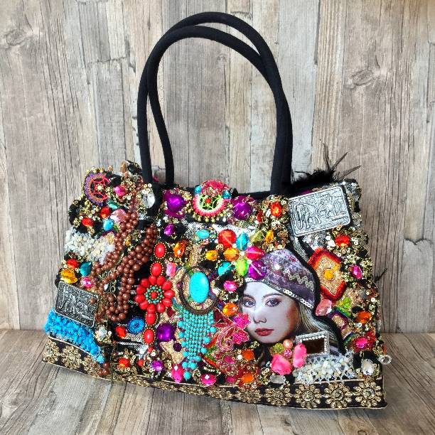Neem een kijkje naar de details van deze tas, zoveel ornamenten, kralen en bandjes die er allemaal