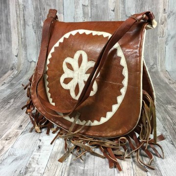Vintage leren boho tasje met opgestikte bloem en franje. Het tasje is van binnen afgezet met een vrolijke stof. Afmetingen: Hoog 24, breed 22. Hengsel ongeveer 98 cm