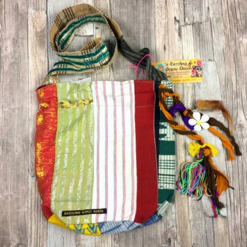 Boho buideltas van vintage stof in Mochila Wayuu Style met leuke gekleurde hangers en veren.
