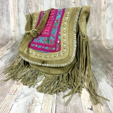 Prachtige suede Banjara tas met franjes en vintage stof.