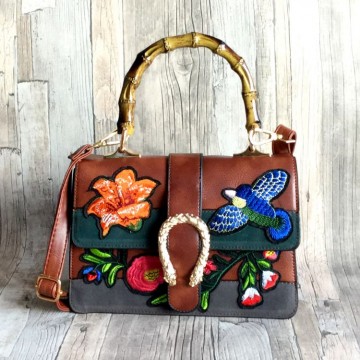 Inspired by G tas met bloemen zwart met bruin en grijs Hoe leuk is deze G - inspired tas? Deze tas van kunstleer heeft prachtige kleurrijke applicaties van bloemen en vogels. Helemaal volgens de laatste zomer trend. Je ziet deze applicaties bij veel designers voorbij komen. Het hengsel van deze hippe tas is van bamboo, maar er zit ook een lange schouderband bij zodat je de tas ook al crossbody kunt dragen. Deze tas maakt je trendy outfit helemaal af en verkrijgbaar in 3 leuke kleuren. Of je nou een leuk jurkje draagt of een versleten spijkerbroek, deze tas staat super leuk! Kortom scoor nu snel zo een hippe Inspired bag voor dat ze op zijn...... De afmeting van deze tas is: Hoogte 17 cm, de breedte is 25 cm en de diepte is 10 cm De schouderband die er bij zit is verstelbaar tot 135 cm.