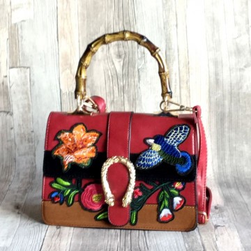 Inspired by G tas met bloemen zwart met rood en bruin. Hoe leuk is deze G - inspired tas? Deze tas van kunstleer heeft prachtige kleurrijke applicaties van bloemen en vogels. Helemaal volgens de laatste zomer trend. Je ziet deze applicaties bij veel designers voorbij komen. Het hengsel van deze hippe tas is van bamboo, maar er zit ook een lange schouderband bij zodat je de tas ook al crossbody kunt dragen. Deze tas maakt je trendy outfit helemaal af en verkrijgbaar in 3 leuke kleuren. Of je nou een leuk jurkje draagt of een versleten spijkerbroek, deze tas staat super leuk! Kortom scoor nu snel zo een hippe Inspired bag voor dat ze op zijn...... De afmeting van deze tas is: Hoogte 17 cm, de breedte is 25 cm en de diepte is 10 cm De schouderband die er bij zit is verstelbaar tot 135 cm.