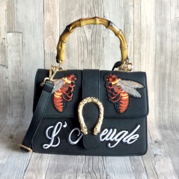 Inspired by G tas zwart met bijtjes en tekst Hoe leuk is deze G - inspired tas? Deze tas van kunstleer heeft prachtige kleurrijke applicaties van bloemen en vogels. Helemaal volgens de laatste zomer trend. Je ziet deze applicaties bij veel designers voorbij komen. Het hengsel van deze hippe tas is van bamboo, maar er zit ook een lange schouderband bij zodat je de tas ook al crossbody kunt dragen. Deze tas maakt je trendy outfit helemaal af en verkrijgbaar in 3 leuke kleuren. Of je nou een leuk jurkje draagt of een versleten spijkerbroek, deze tas staat super leuk! Kortom scoor nu snel zo een hippe Inspired bag voor dat ze op zijn...... De afmeting van deze tas is: Hoogte 17 cm, de breedte is 25 cm en de diepte is 10 cm De schouderband die er bij zit is verstelbaar tot 135 cm.