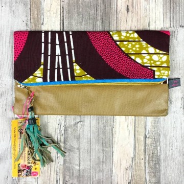 Clutchtasje van kunstleer en Afrikaanse Wax print stof met  leren kwastje aan de rits.