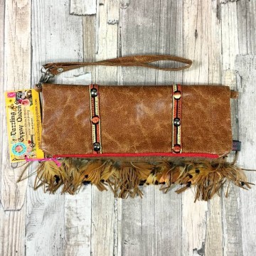 Hot Bags Clutch tas, bruin kunstleer, verenstof en veertjes