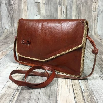 Vintage handgemaakt hippie festival tasje van leer. Afmeting: Breedte is 25 cm, hoogte 18 cm, diep 6 cm