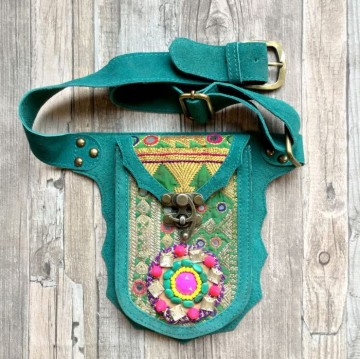 Festival heuptasje van Turquoise suede met vintage Banjara stof. En op de voorkant zit een unieke handgemaakte kralen badge genaaid....