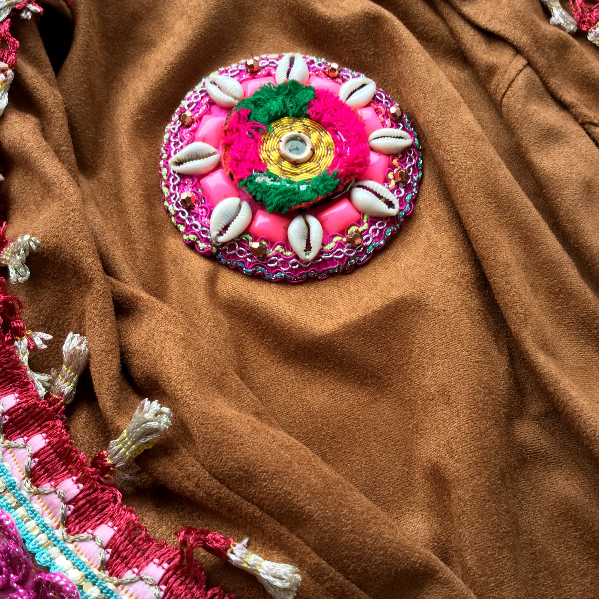 Deze boho gilet bodywarmer is handmade en voorzien van mooi versierd band.